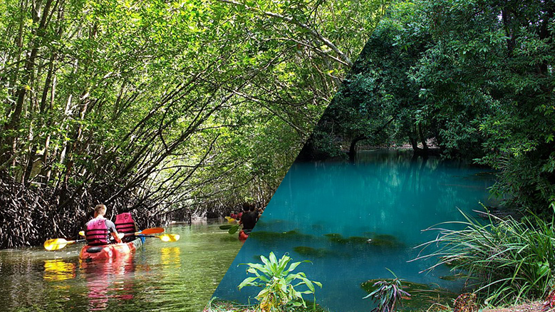 through nature rich in wildlife. High chance to spot monkeys, mudskipper, crabs and shells. The area is known as the “Mangrove Maze” with many different paths to explore.